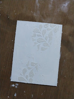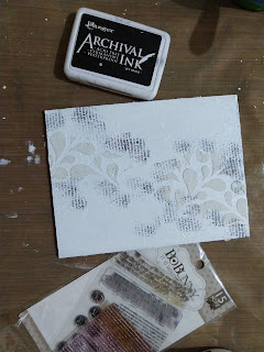 Apply Frayed Burlap and Peacock Feathers Distress Inks through the stencils onto the cream cardstock.