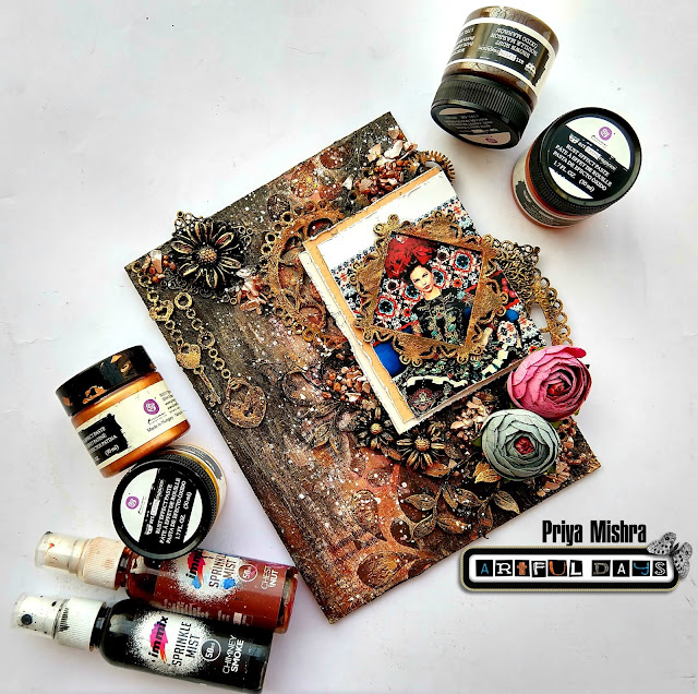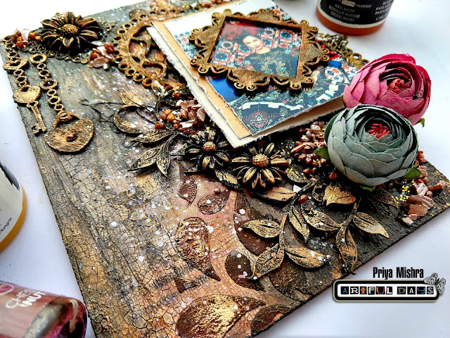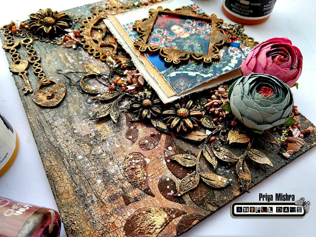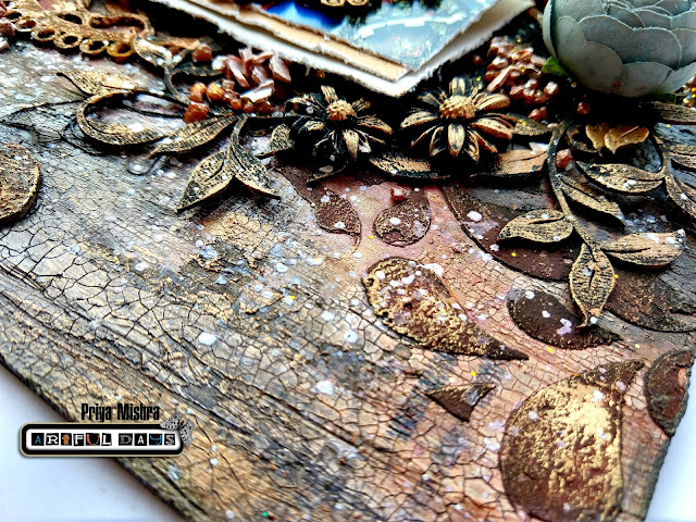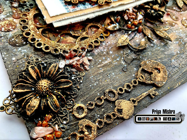 Finally I added some resin flowers and two beautiful from AD store. The resin flowers were first given a coat of black gesso and then some Patina effect paste.